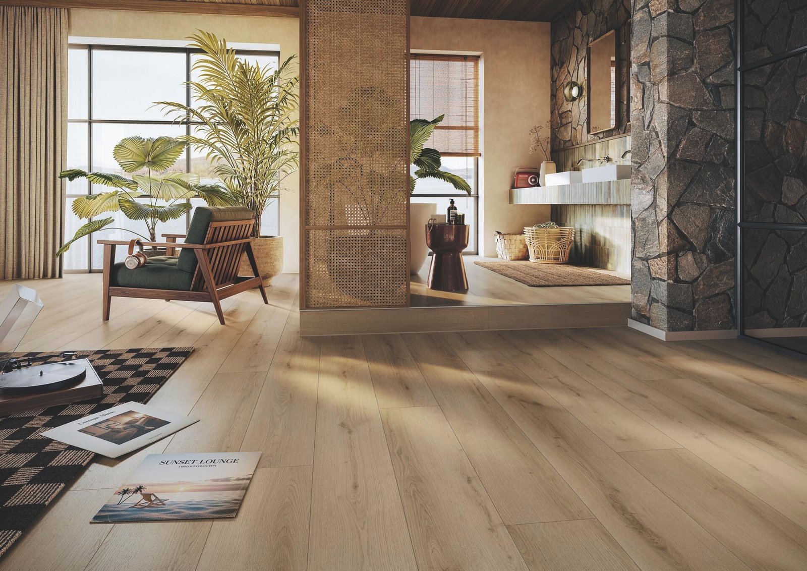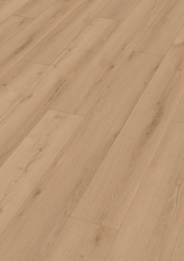 Su tonalidad clara con base marrón claro, combinada con el bisel en V a cuatro lados, define cada tablón y realza la profundidad visual del conjunto, creando ambientes luminosos, acogedores y atemporales. Una opción que equilibra diseño, resistencia al agua y confort, respaldada por la calidad de Meister.