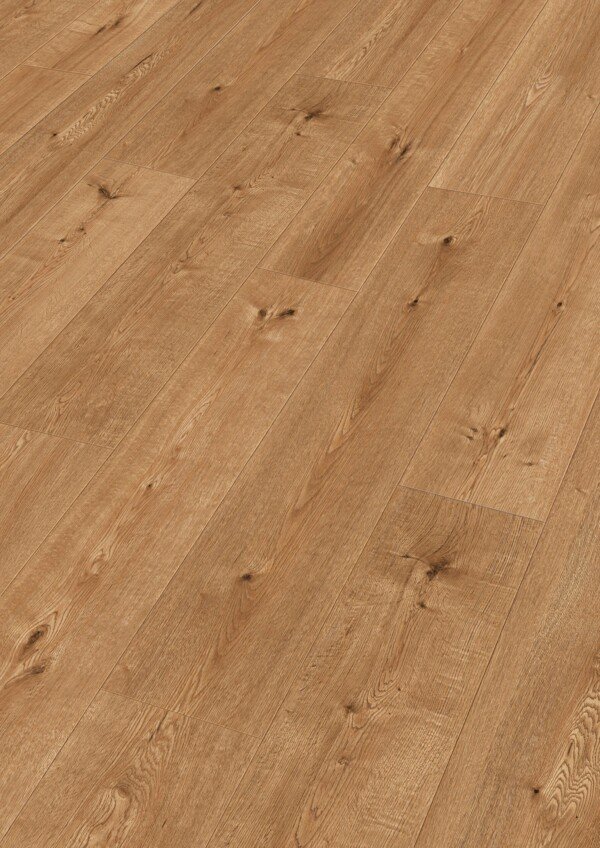 La superficie presenta una estructura Natural Wood que reproduce fielmente la textura de la madera natural, aportando realismo y calidez visual. El microbisel a cuatro lados define cada tablón y aporta profundidad al conjunto, mientras que su tonalidad de gama media, con base marrón, crea ambientes acogedores, armónicos y atemporales. Puede instalarse de forma flotante mediante el sistema 5G Dry®, que garantiza una colocación rápida, segura y especialmente fiable frente a la humedad.