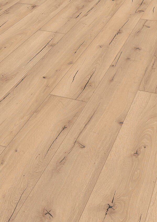 El MeisterDesign. laminate LL 150 – Roble agrietado claro es un suelo laminado de formato XXL que combina amplitud visual, luminosidad y un carácter natural muy marcado. Sus tablones de más de 2 metros de longitud aportan continuidad y elegancia, siendo especialmente adecuados para estancias grandes donde el suelo se convierte en un elemento protagonista.
