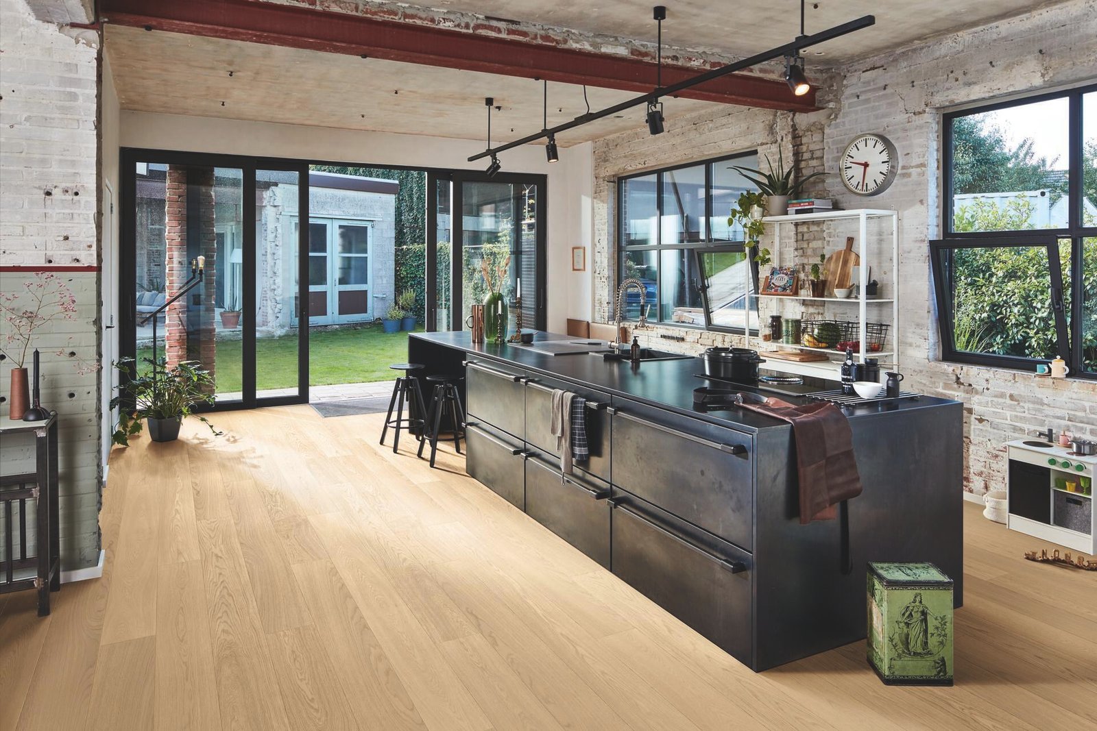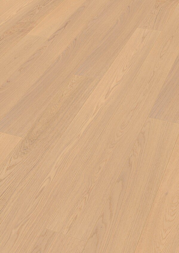 El MeisterParquet. longlife PD 400 – Roble armónico puro es un parquet de tablón largo que representa la esencia de la madera natural en su forma más elegante y atemporal. Con una longitud de 2,20 metros, el clásico formato de casa de campo crea una sensación de amplitud, continuidad y equilibrio visual, convirtiéndose en una elección ideal para espacios amplios y luminosos.
