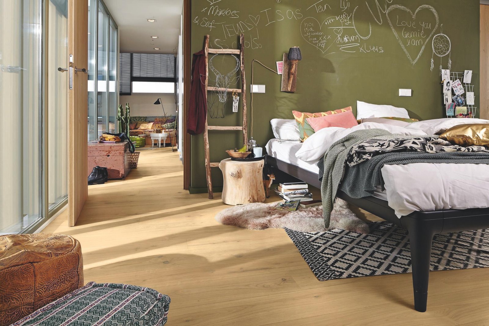 El suelo de madera MeisterParquet. longlife PD 400 – Roble auténtico aspecto decapado es una opción ideal para quienes buscan un estilo natural, luminoso y con un toque artesanal. Su formato clásico de tablón de casa de campo, con una longitud de 2,20 m, aporta continuidad visual y una elegancia atemporal que encaja tanto en interiores modernos como en ambientes de inspiración rústica o nórdica.