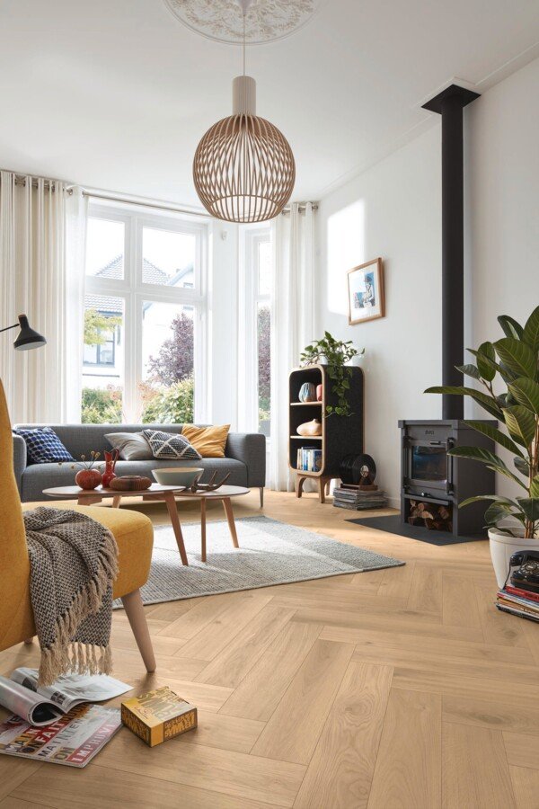 Una opción ideal si buscas un parquet en espiga claro y elegante, con la autenticidad del roble, un acabado ultramate resistente y una estética luminosa que aporta equilibrio, sofisticación y durabilidad a cualquier estancia.