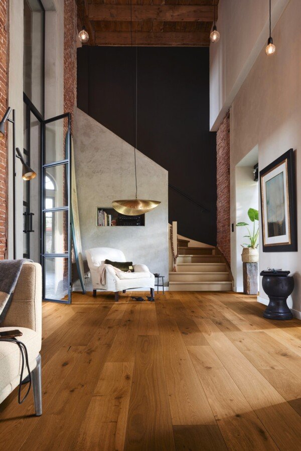 El acabado aceitado natural de alta calidad realza la belleza del roble oscuro, aportando un tacto cálido y una estética mate muy natural. La superficie Weartec Nature, elaborada a partir de ceras y aceites procedentes de materias primas naturales renovables, protege la madera respetando su estructura y permitiendo que envejezca con elegancia. Como toda la gama MeisterParquet. longlife, este suelo es especialmente adecuado para la colocación flotante sobre calefacción por suelo radiante.