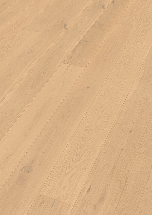 El suelo de madera MeisterParquet. longlife PD 400 – Roble auténtico puro es una elección ideal para quienes buscan naturalidad, luminosidad y una estética limpia y atemporal. Su formato clásico de tablón de casa de campo, con una longitud de 2,20 m, aporta continuidad visual y una elegancia serena que encaja en todo tipo de interiores.
