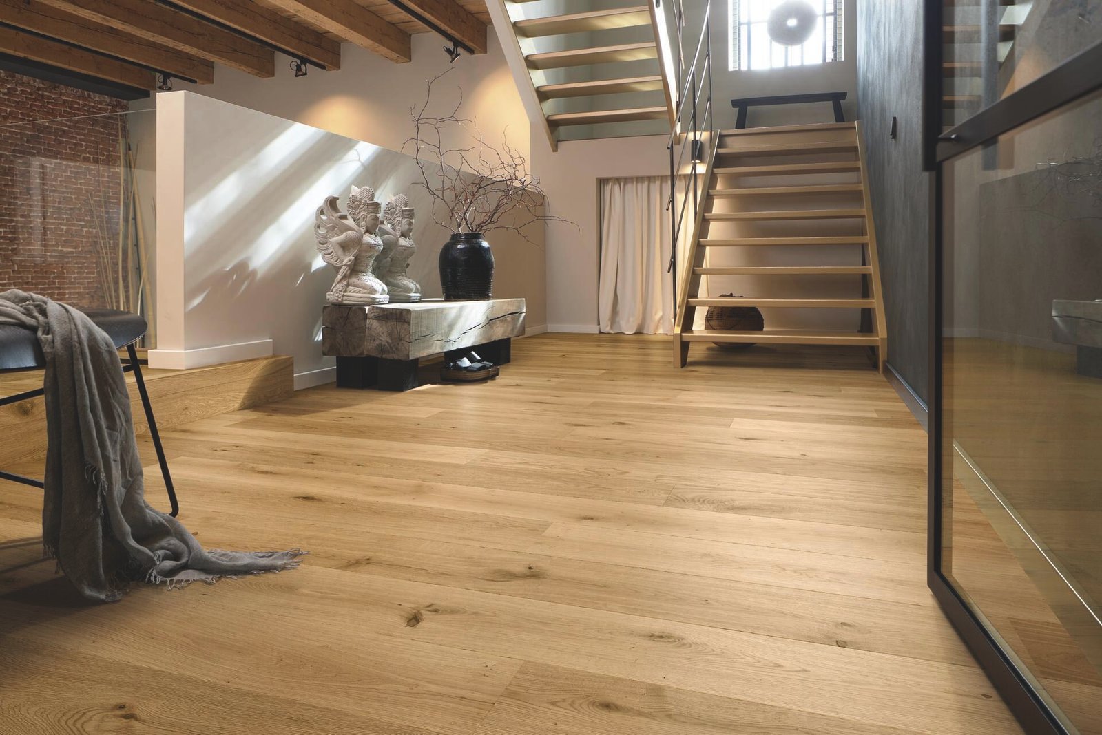El MeisterParquet. longlife PD 400 – Roble auténtico puro es un parquet de tablón largo que expresa la esencia más natural del roble en un formato clásico y elegante. Sus tablones de casa de campo de 2,20 metros crean una continuidad visual amplia y armónica, ideal para estancias donde se busca una sensación de espacio, equilibrio y autenticidad.