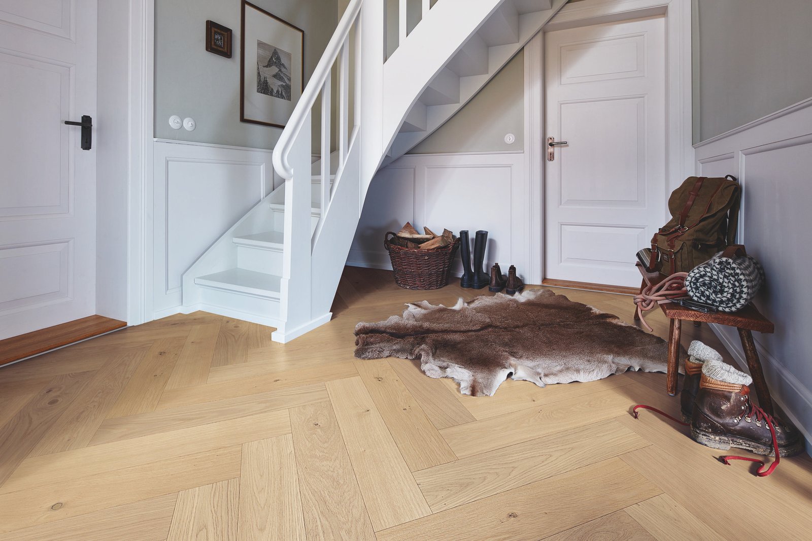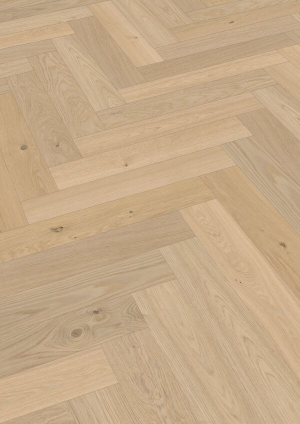 El suelo de madera Lindura HS 500 – Roble clásico alabastro aporta una reinterpretación luminosa y elegante del patrón en espiga, ideal para interiores que buscan amplitud visual, serenidad y un estilo atemporal. Su tono blanco alabastro suaviza la veta del roble y crea espacios claros, equilibrados y muy actuales, sin renunciar a la autenticidad de la madera natural.