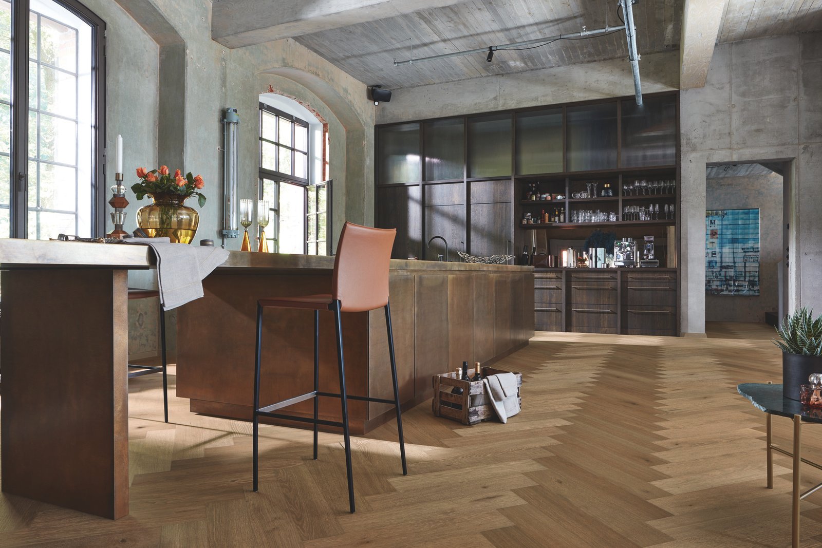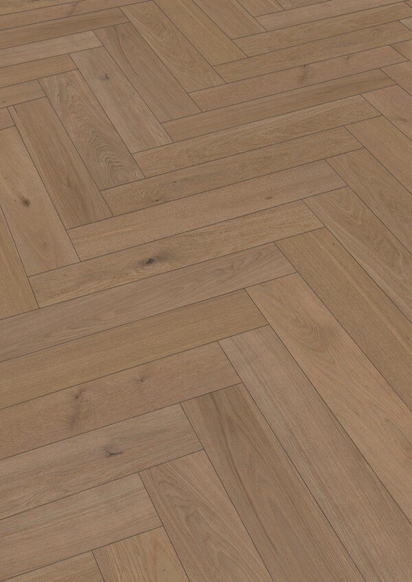 La estructura cepillada resalta la veta de la madera y añade carácter, mientras que el microbisel a cuatro lados define cada pieza y potencia el dibujo geométrico de la espiga. Gracias al sistema clic UniZip, la instalación resulta rápida y precisa, permitiendo colocación flotante o encolada en toda la superficie con un único tipo de tablón.