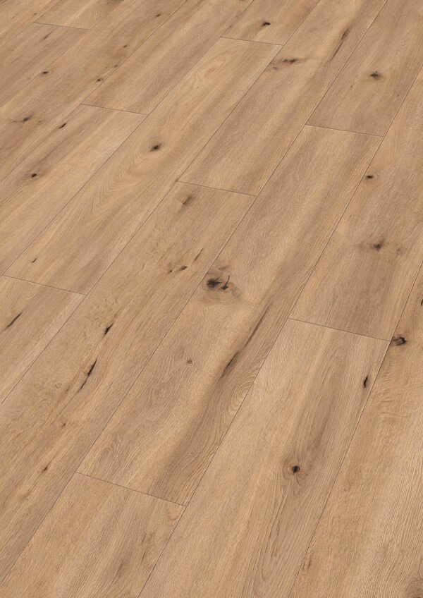 La superficie presenta una estructura Natural Wood que reproduce con gran realismo el aspecto de la madera natural, aportando textura y profundidad al conjunto. El microbisel a cuatro lados define cada tablón y refuerza el efecto visual, mientras que su tonalidad de gama media con base marrón claro crea ambientes cálidos, luminosos y acogedores. Puede instalarse de forma flotante mediante el sistema 5G Dry®, que garantiza una colocación rápida, segura y especialmente fiable frente a la humedad.