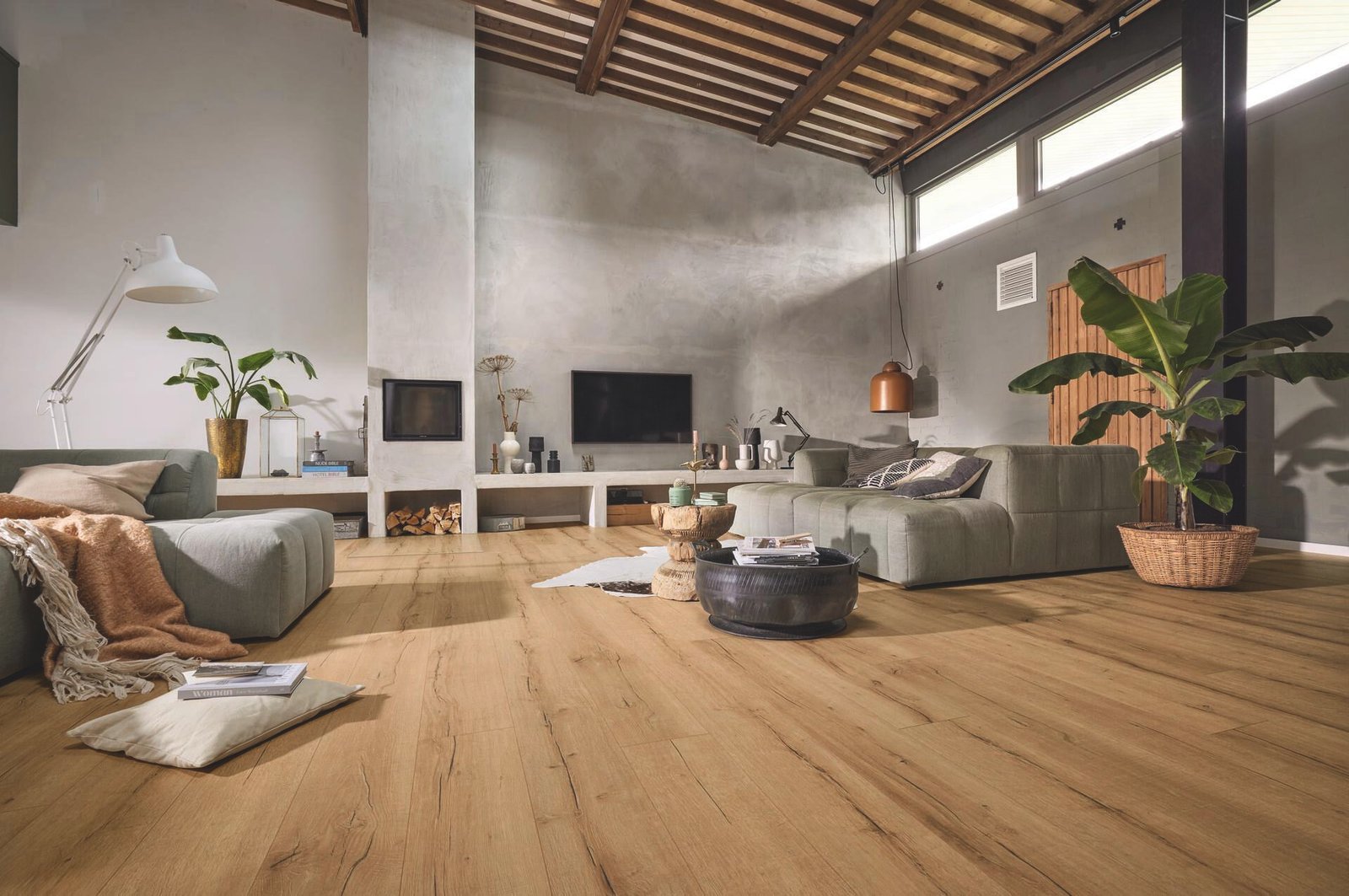 Una opción ideal si buscas un suelo de diseño con estética de madera envejecida, gran formato de tablón y una combinación avanzada de resistencia al agua, confort acústico y durabilidad para el día a día.