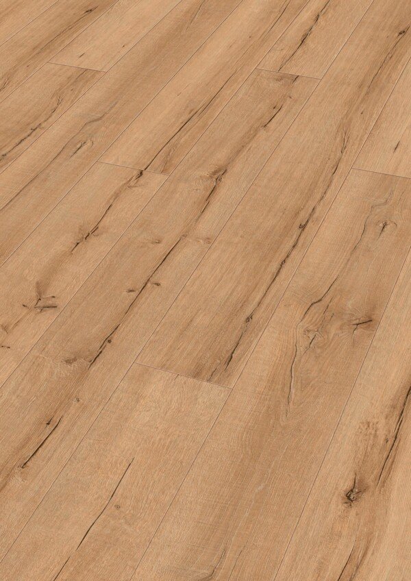 La superficie presenta una estructura sincronizada porosa que reproduce con gran realismo la textura de la madera envejecida. El microbisel a cuatro lados define cada tablón y aporta relieve al conjunto, mientras que su tonalidad de gama media, con base marrón, crea ambientes cálidos, naturales y con personalidad. Puede instalarse de forma flotante mediante el sistema 5G Dry®, que garantiza una colocación rápida, segura y especialmente fiable frente a la humedad.
