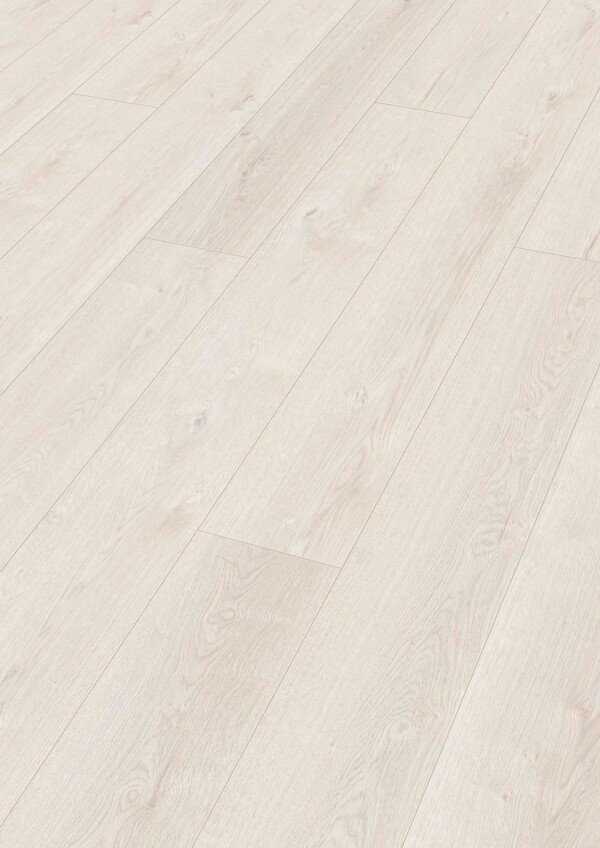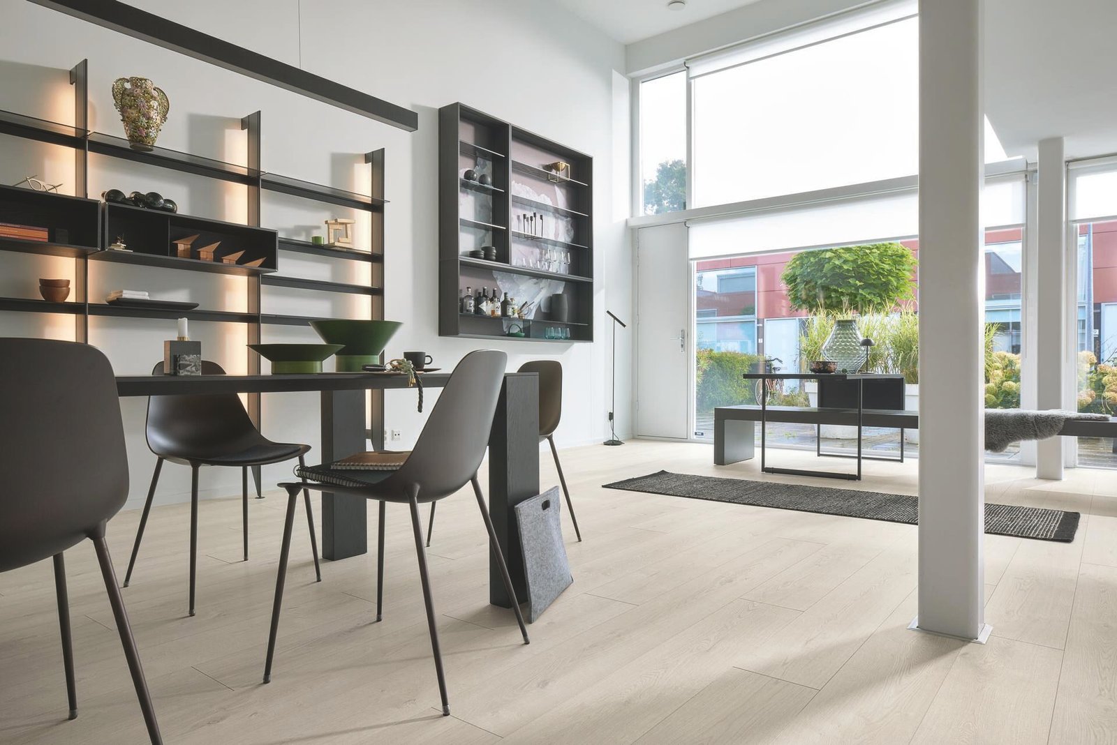 El suelo de diseño MeisterDesign. next DL 500 S – Roble mountain white es una solución innovadora y sostenible que combina una estética de roble blanco muy luminosa con un alto nivel de confort y resistencia. Gracias a su estructura modular de alta calidad con aislamiento acústico integrado de corcho natural, ofrece una pisada silenciosa y agradable, siendo apto tanto para salones y dormitorios como para cocinas y baños, incluso sobre calefacción por suelo radiante.