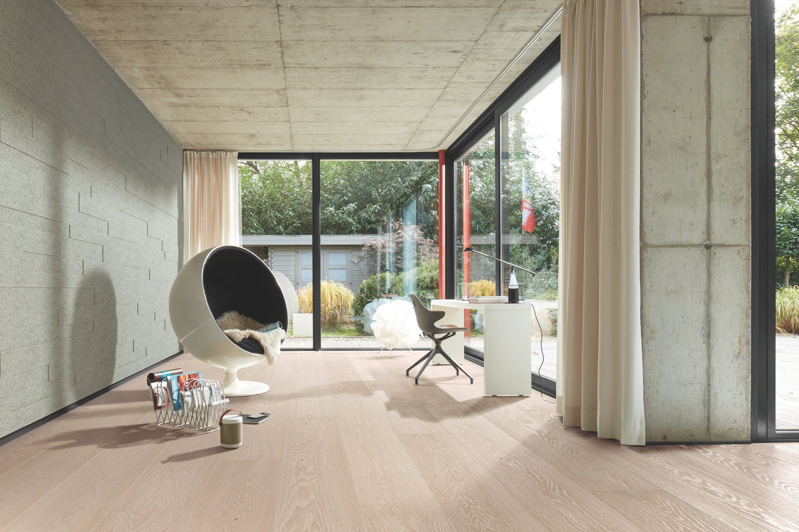 El suelo de madera Lindura HD 400 – Roble natural blanco polar 08920 destaca por su formato de tablones de casa de campo, una opción que luce especialmente elegante en espacios amplios, aportando sensación de continuidad, luminosidad y un estilo natural muy refinado.