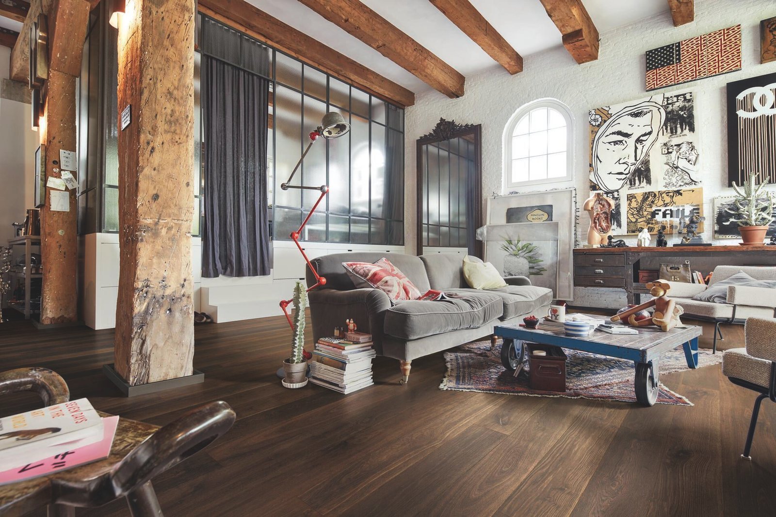 La clasificación viva resalta las vetas marcadas y variaciones naturales del roble, aportando dinamismo y autenticidad al conjunto. El acabado ahumado, con una tonalidad oscura de base marrón oscuro, crea ambientes elegantes y envolventes, perfectos para espacios contemporáneos o de estilo industrial. La estructura cepillada refuerza el tacto natural de la madera, mientras que el bisel en V longitudinal con microbisel en el lado corto define cada tablón y añade profundidad visual. Puede instalarse flotante o encolado en toda la superficie mediante el sistema Masterclic Plus, que garantiza una colocación rápida, limpia y segura.