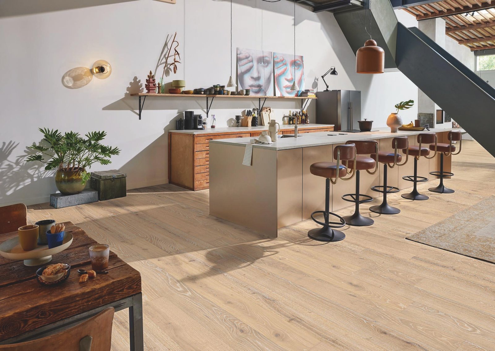 La estructura cepillada potencia el carácter vivo del roble, mientras que el microbisel a cuatro lados define cada tablón y añade profundidad visual al conjunto. Puede instalarse flotante o encolado en toda la superficie, gracias al sistema Multiclic, que garantiza una colocación segura, precisa y eficiente.