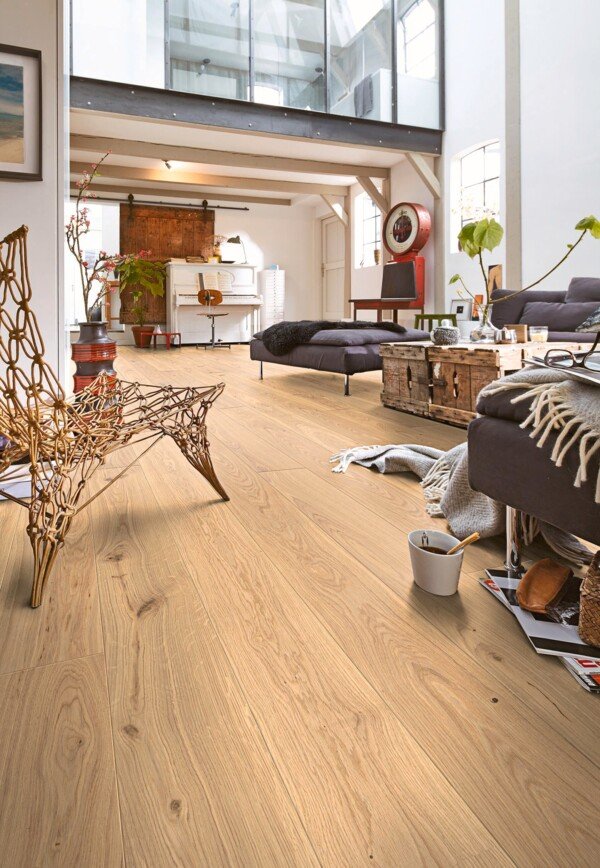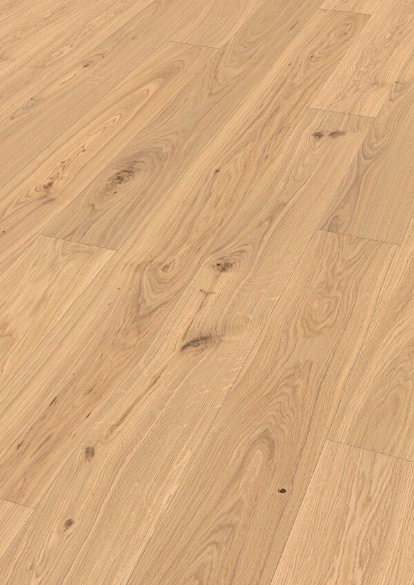 El suelo de madera MeisterParquet. longlife PD 400 – Roble vivo claro natural es una opción perfecta para quienes buscan luminosidad, naturalidad y un acabado auténtico. Su formato clásico de tablón de casa de campo, con una longitud de 2,20 m, aporta continuidad visual y una elegancia atemporal que realza cualquier espacio.