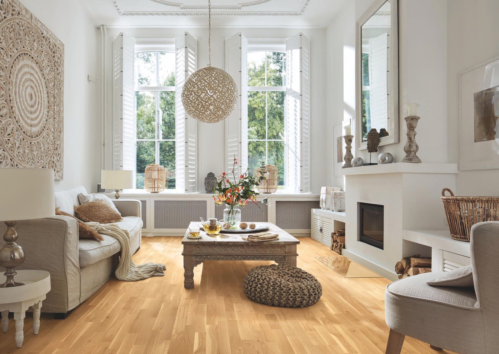 La clasificación vivo potencia la expresividad natural del roble, mostrando variaciones de veta y tono que aportan autenticidad y dinamismo al pavimento. La estructura cepillada refuerza el tacto natural de la madera, mientras que su tonalidad clara de base marrón claro aporta calidez, luminosidad y una sensación acogedora en el espacio. Puede instalarse de forma flotante o encolado en toda la superficie gracias al sistema Masterclic Plus, que garantiza una colocación rápida, precisa y segura mediante sistema de plegado.