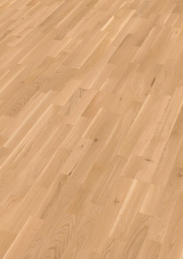 El suelo de madera MeisterParquet. longlife PC 200 – Roble vivo puro es una opción natural y luminosa que combina el carácter expresivo del roble con el clásico patrón de colocación a la inglesa. Este sistema crea una superficie variada y dinámica a partir de fragmentos de madera que, en conjunto, mantienen una composición armónica y equilibrada, adecuada para estancias de cualquier tamaño.