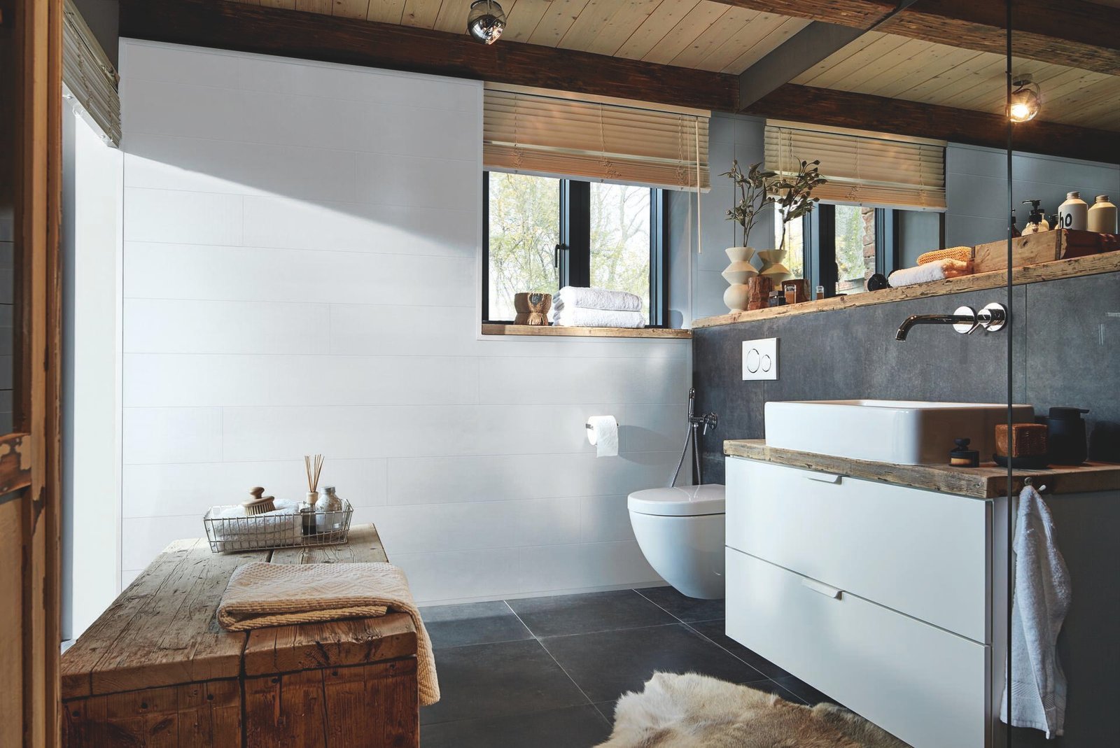 La gama MeisterPanels. terra se distingue por su estructura especial con superficie Terracell y tablero de soporte Terragen, que incorpora un efecto antimoho probado, lo que los hace especialmente adecuados para ambientes con alta humedad. Además, sus bordes del lado corto especialmente tratados permiten una instalación continua sin juntas visibles, logrando un resultado homogéneo y elegante.