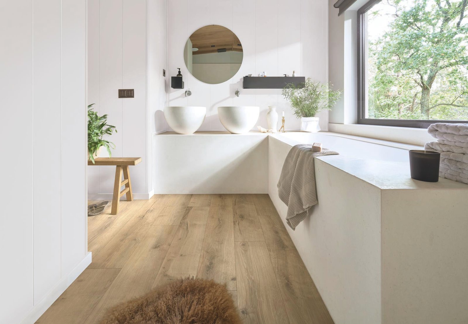 La gama MeisterPanels. terra se distingue por su estructura especial con superficie Terracell y tablero de soporte Terragen, que ofrece un efecto antimoho probado, haciendo que estos paneles sean especialmente adecuados para ambientes con humedad elevada. Además, cuentan con bordes del lado corto especialmente tratados, lo que permite una instalación continua sin juntas visibles, logrando un resultado homogéneo y de gran calidad visual.